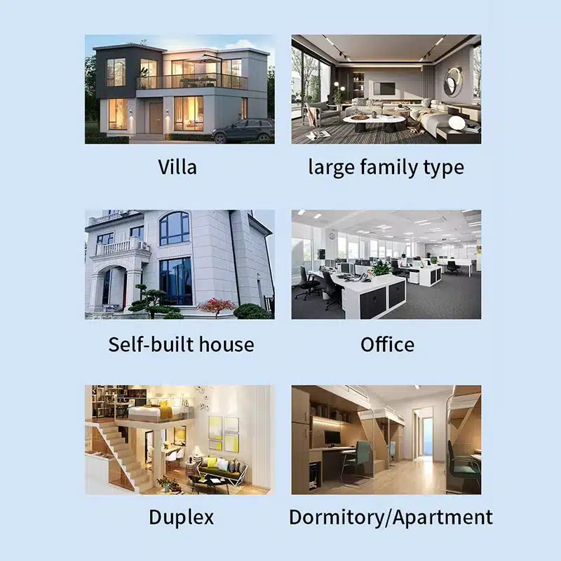 The image materials emphasize use in villas, duplexes, self-built houses, apartments, and small office environments. For distributors and project buyers, this gives the product a wider mainstream application range.